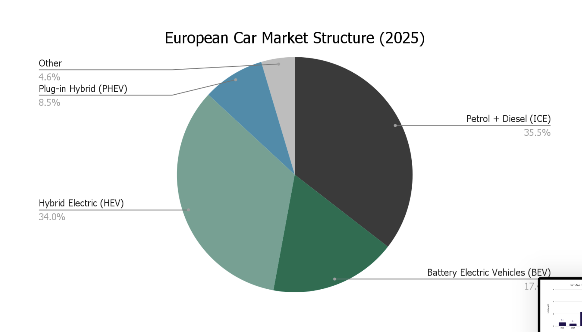 In parallel, as the EV market is growing, petrol and diesel vehicle share has collapsed from a combined share of 45.2% in 2024 to 35.5% in 2025. So at last, the issue is very simple. The structural shift of the European market towards electrification has given way to extremely competitive products from Chinese car manufacturers. And we have to consider that this is not a light matter, this is a fight over who captures the next industrial base and pioneers in the European auto sector.