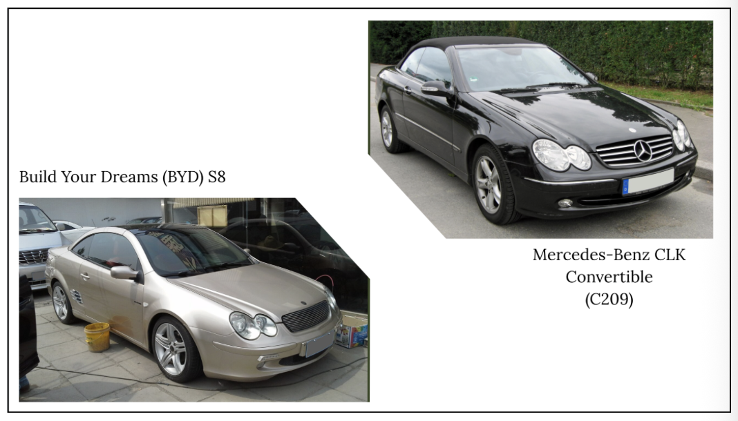 As well as taking advantage of the economic situation during the 90s the Chinese EV corporation has been accused numerous times of copying designs of other car manufacturers. Perhaps the most prominent culprits for this imitation strategy are the early 2000s vehicles. Models like the BYD F3 (2005), resembling a Toyota Corolla, and the BYD S8 in 2007, being a Mercedes-Benz CLK convertible. Other models like the BYD F3 were compared by the industry as the Chinese Toyota Corolla and Honda Fit.