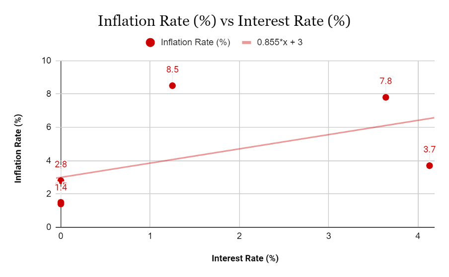 Using the data from Figure 4, I calculated the correlation between the interest rates and inflation, the result was 0.5243, which suggests a weak positive relationship. This might insinuate that interest rates do not really affect inflation as the value is not very close to 1. However, as Figure 6 suggests, 2022 could be counted as an outlier as the inflation rate suddenly shot up to 8.5%. If in the analysis, the outlier is ignored, then the correlation calculated is 0.8159. This number represents a strong positive linear correlation between interest rates and inflation, which is not what we expected. The positively linear relationship proposes that the higher the inflation rate, the higher the interest rates. As previously mentioned, in economic theory, higher interest rates should cause lower inflation.
