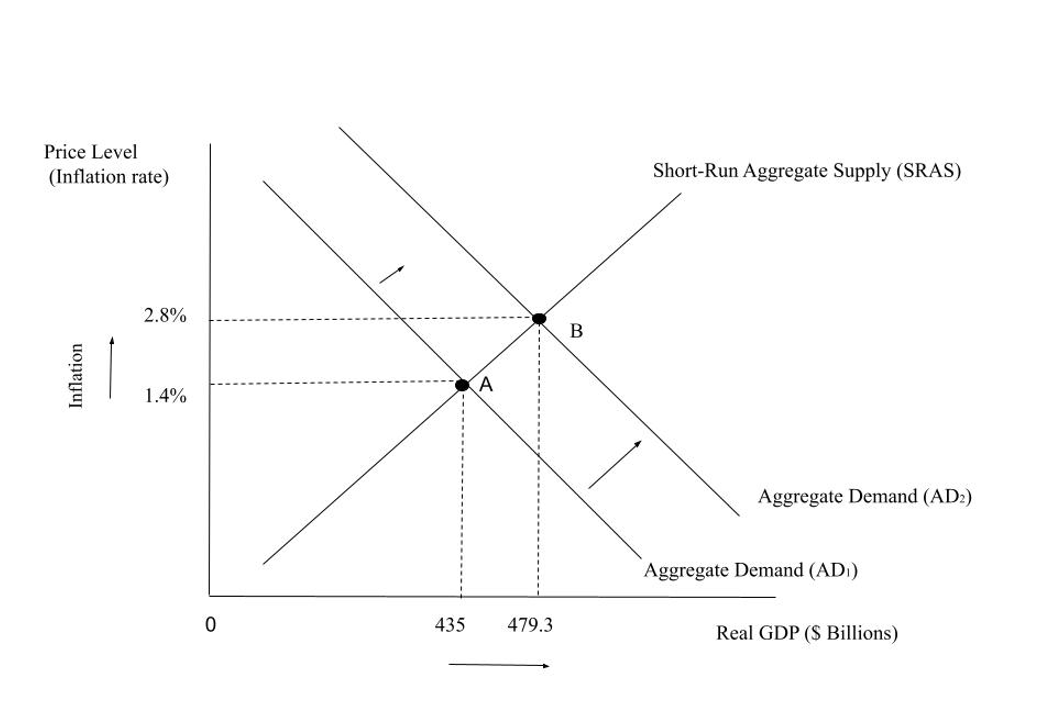 As shown by figure 1, expansionary monetary policy resulted in an increase in aggregate demand from AD(1) to AD(2). Aggregate demand is defined as the total amount of goods and services demanded in an economy at a given time and price level. It can be measured with the following formula: