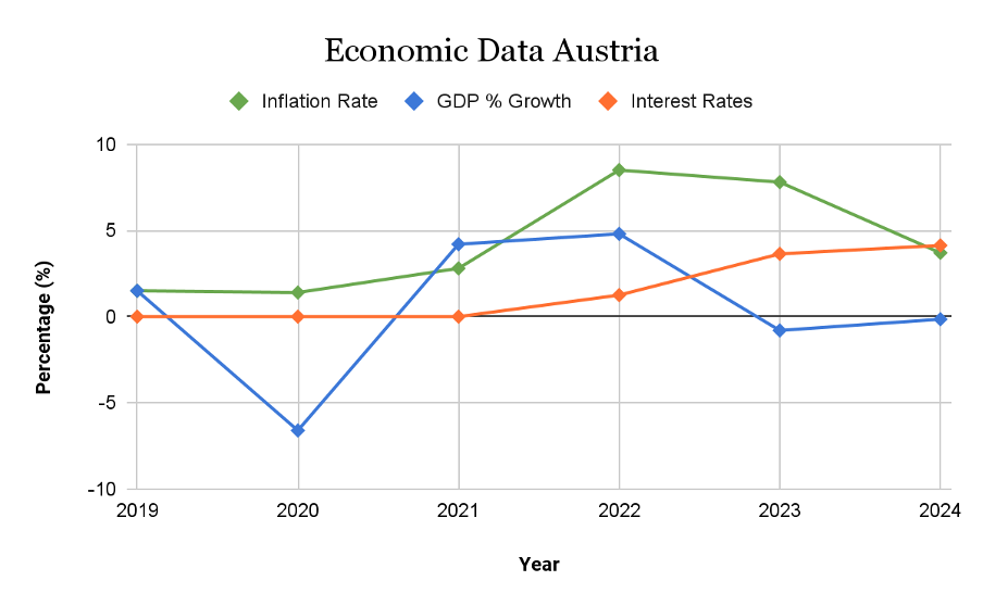 Austria is part of the European Union and it has experienced major financial setbacks throughout the last 5 years. Being a member of the eurozone, decisions regarding the country’s monetary policy are taken by the European Central Bank (ECB). This means that Austria is influenced by the European Central Bank regarding interest rate adjustments. However, unique economic conditions within Austria have played a role in shaping how these policies have translated into actual outcomes in comparison to aims and expectations. Furthermore, the interaction between global economic occurrences, such as shifts in energy prices, geopolitical events and supply chain issues, have added to the complexity of Austria's inflationary pressures. These external factors, outside of the control of Banks in the Eurozone, combined with local policy responses, create a versatile environment. This makes it essential to analyse how Austria’s monetary policy has adapted to these evolving challenges and whether its main role of changing aggregate demand was effective.