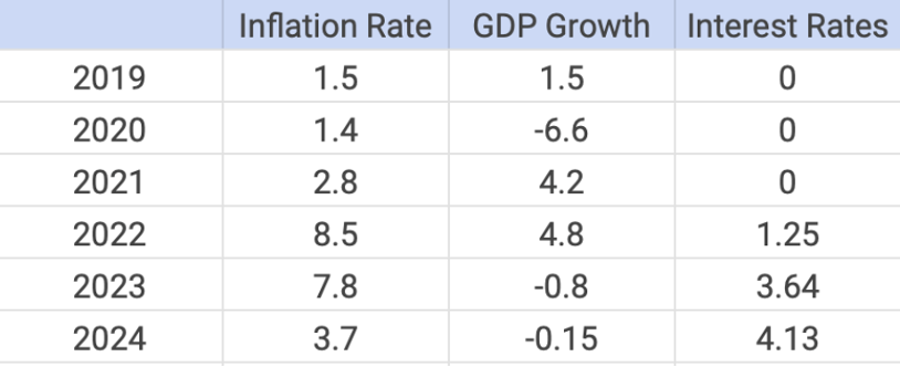 I expect to find an inversely proportional relationship between interest rates and inflation, where lower interest rates correspond with higher demand-pull inflation. For the 2024 data, I will use the average from the first half of the year, thus the first and the second quarter.