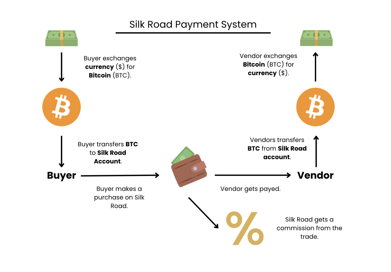 Silk Road used a built-in escrow system meaning that it temporarily held funds in order to facilitate the given payment. Using a combination of mixing/tumbling techniques, the transactions were kept by redistributing funds across wallets. At the base, the transaction system operated on the following principle: a buyer would purchase their need on the market using bitcoin. The moment this happens the cryptocurrency funds entered Silk Road wallets and the transactions were routed through multiple addresses. The vendors received Bitcoin and later converted them into fiat money reused in the crypto system. Fundamentally, Bitcoin acted as a sort of layering tool that did not provide enough anonymity to be untraceable, but offered enough obfuscation.